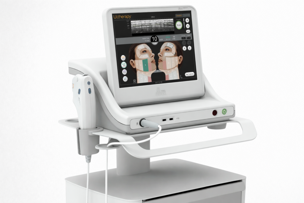 Ultherapy®, an FDA-cleared ultrasound technology that lifts and tightens skin naturally. It delivers focused energy deep beneath the surface to boost collagen and elastin, creating a firmer, more youthful look—without surgery or downtime.